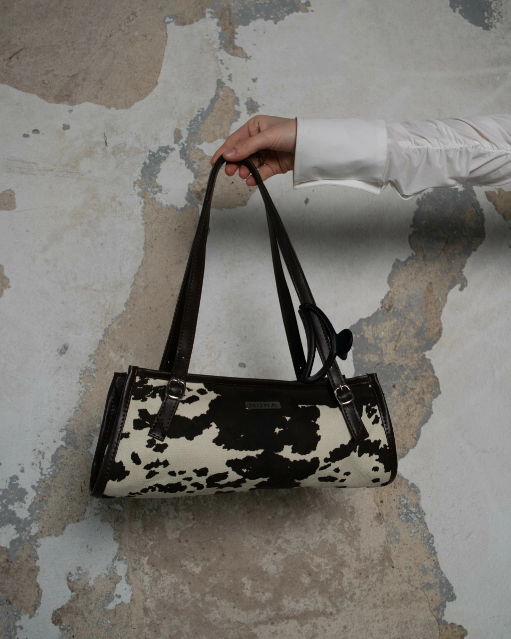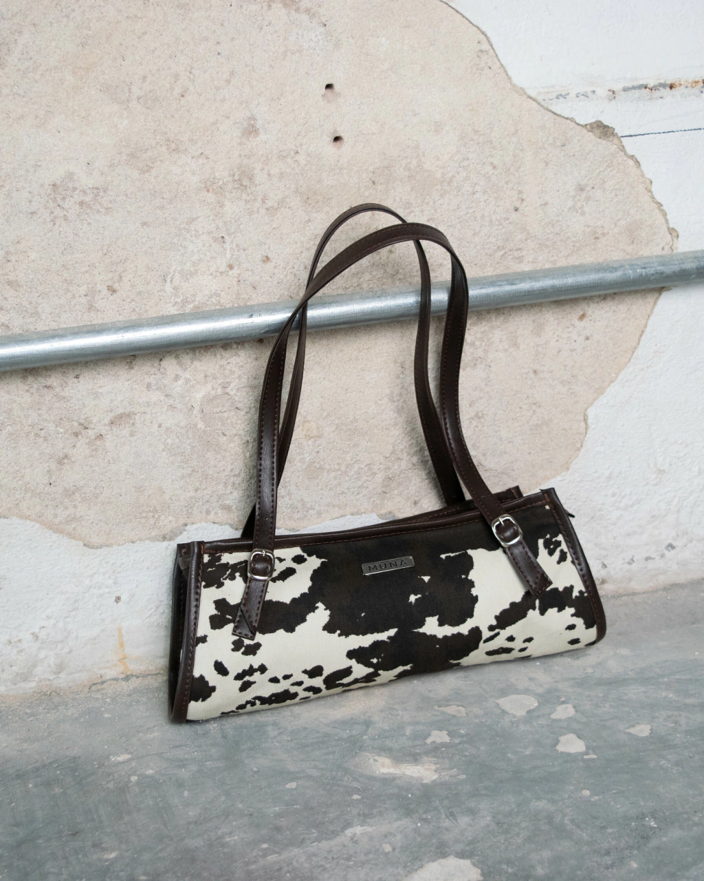 Mini bag confeccionada en tela estampada con patrón VACA con detalles en PU color marrón. Incluye tira cierre con el logo MUNA (#detalles✨). Su tamaño es ideal para llevar lo esencial y un poquito más.